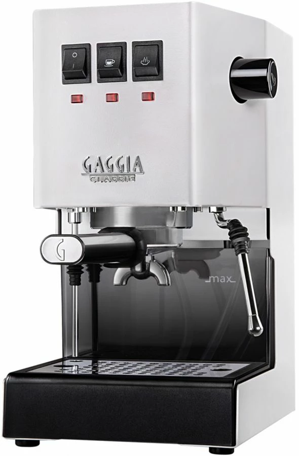 The New Gaggia Classic Espresso Machine (Pro Classic) has the same size, style and weight as the professional machines; the chromed brass group and filter holder are designed to guarantee optimal coffee temperature throughout the entire brewing process and an improved in-cup quality.