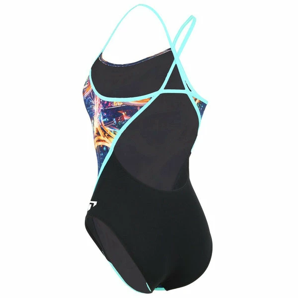 The Michael Phelps Trafic Raceback swimsuit for women, with its contrasts of light and dark, this design is about feeling an energy that flows non-stop.