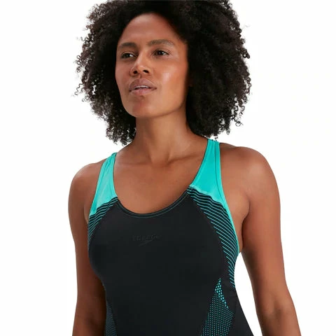 Stylish swimwear that performs.Stylish swimwear that performs. With clean lines, contrasting vivid green straps and a panelling print, you’ll look the part in your fitness training wearing our flattering Laneback swimsuit. An inner bust shelf liner helps provide a supportive fit so you can focus on your performance, while our 100% chlorine resistant Endurance+ fabric is quick drying after your workout.