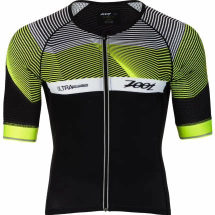 Leading the way in technology advancements, Zoot is using CARBON fabric in the Ultra Tri Short Sleeve Aero Jersey for the most cutting edge performance benefits. CARBON fabric reduces heat build-up to help regulate body temperature during intense exercise. CARBON fabric also has anti-microbial effects and incredible moisture wicking to keep you dry and comfortable for the long haul. The added benefit of UPF 50+ will protect you from the sun. The aerodynamic advantages of the textured fabric in the sleeves makes this the perfect jersey for race day. Â